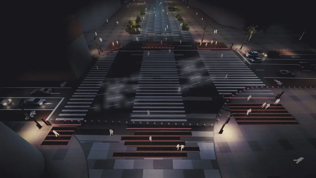 此次交通节点的形象设计工作在传统交通设计基础上,通过大量的现场调研、数据分析、交通路径、行为模式分析研究,将过街语音提示、过街灯光秀、高荷载地面发光字整合在智能过街系统中,在国内属于首例。