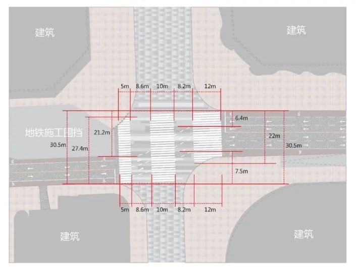 王府井步行街日均客流量达60万人/日,节假日高峰期客流量可达120万人/日,步行街南北客流较大,交换频繁,在道路设计时,此路口设置三条斑马线,以提升路口人行通行效率。通过基础调研数据分析,结合近远期客流预测,设计人行通行等级划定为E级,常规通行情况下此时间段可满足243人安全有效过街。