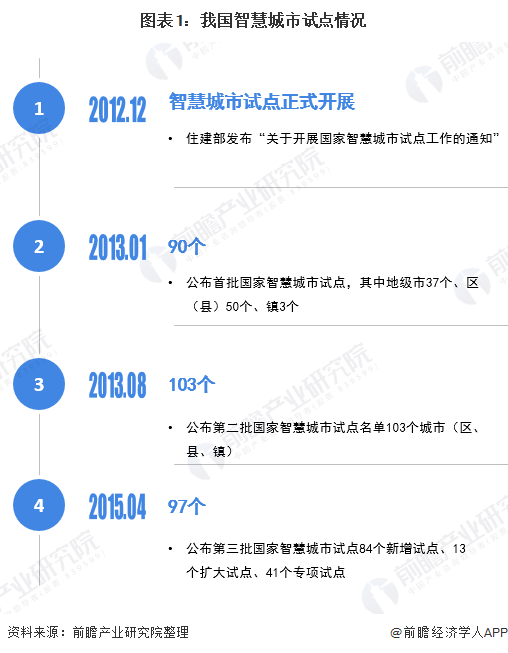 从国家开始推进智慧城市建设以来,住建部发布三批智慧城市试点名单。其中第一批在2013年1月发布,共包含90个城市(区),其中地级市37个,区50个,镇3个;第二批于2013年8月公布,共包含103个试点;2014年公布第三批试点,共计93个,其中84个新增试点,13个扩建试点。截至目前,住建部公布的智慧城市试点数量已经达到290个。