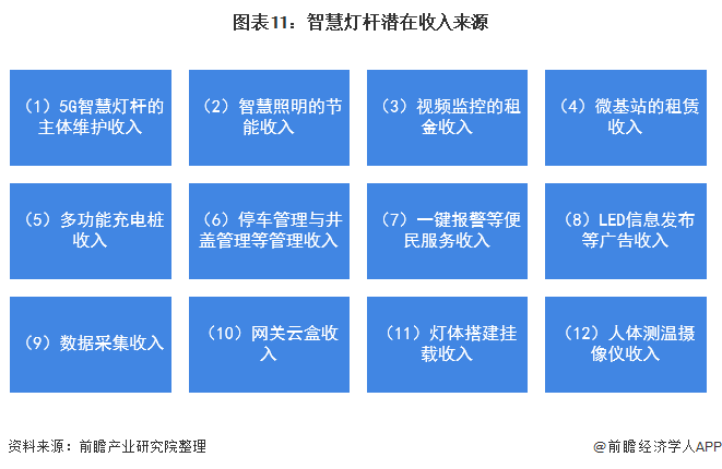 在此趋势下,智慧灯杆行业发展前景广阔,未来一片蓝海。从企业/运营商运营角度出发,智慧灯杆将产生多项运营收入,如补贴、安装、运维、搭载、广告、能源、基站、数据等都将带来收入。