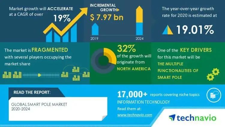 Technavio发布了最新的标题为“ 2020-2024年全球智能杆市场”的市场研究报告,预计2020-2024年,全球智能杆市场规模预计将增长79.7亿美元。
