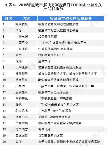 从智慧城市建设的上游来看,随着各领域领先企业陆续进入智慧城市建设领域,智慧城市解决方案提供商在各个领域发挥自身优势,竞争愈发激烈。2019《互联网周刊》与eNet研究院发布的“2019智慧城市解决方案提供商100强名单”,海康威视、华为、中国电信、中国平安、中兴通讯等入榜前二十榜单。