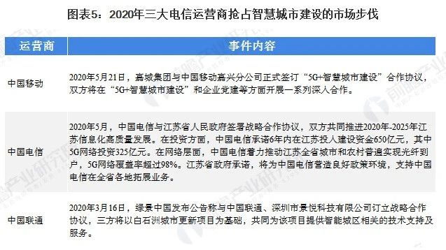 在上游运营商方面,运营商作为通信网络的建设和运营者,在物联网的建设方面具有较大优势,智慧城市也成为三大电信运营商抢夺的市场。2020年5月,嘉城集团与中国移动嘉兴分公司正式签订“5G+智慧城市建设”合作协议,双方将在“5G+智慧城市建设”和企业党建等方面开展一系列深入合作。与此同时,中国电信与江苏省人民政府签署战略合作协议,双方共同推进2020年-2025年江苏信息化高质量发展。2020年3月,绿景中国与中国联通、深圳市景悦科技有限公司订立战略合作协议,三方将以白石洲城市更新项目为基础,共同为该项目提供智能城区相关的技术支持及服务。