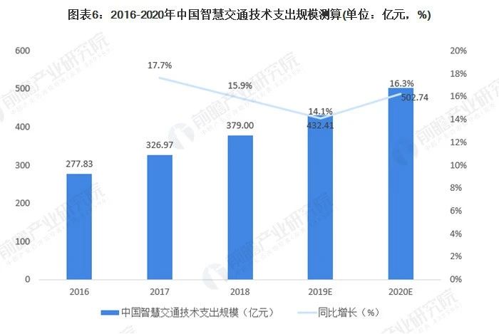从下游来看,智慧城市建设包含多种应用领域。智慧交通方面,根据2020年2月最新发布的《全球智慧城市支出指南》,至2020年,中国市场支出规模将达到266亿美元。根据CCID(赛迪顾问)数据,中国智慧城市IT投资结构中,智慧交通占27%。按27%比例测算,2019年,中国智慧交通技术支出规模61.77亿美元,通过汇率换算(按美元兑人民币汇率1:7),技术支出规模为432.41亿元,2020年技术支出规模为502.74亿元。