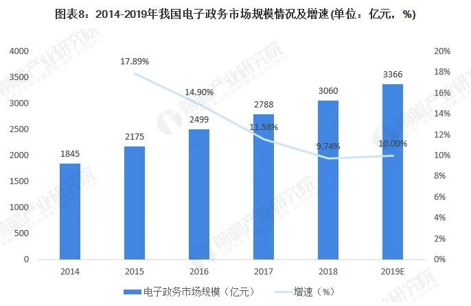 智慧政务方面,智慧政务在“智慧城市”的规划建设中,“智慧政府”是其中的一个重点领域,而电子政务是“智慧政府”的最直观体现。2014-2018年期间我国电子政务市场规模逐年扩张,年均复合增长率为13.48%。2018年电子政务市场规模为3060亿元,同比增长9.74%,初步估计2019年我国电子政务市场规模保持较高增速增长,市场规模近3366亿元。