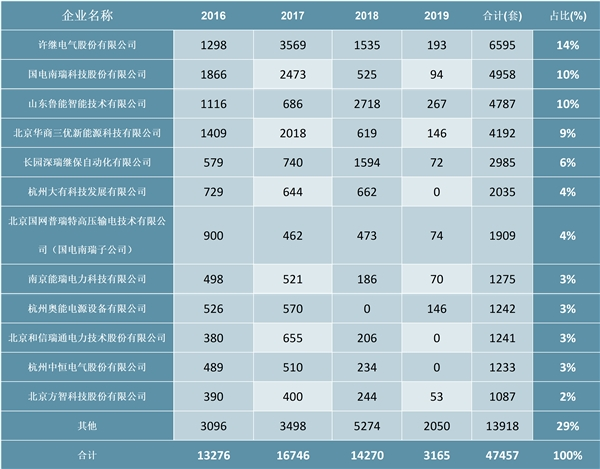 4年来中标的企业共有48家,其中中标数量超过1000家的企业有12家,占据整个市场的70.67%。中标数量前三的是国电南瑞(包括子公司北京国网普瑞特高压输电技术有限公司)、许继电气和山东鲁能智能技术有限公司,市占率分别为14.5%、13.9%、10.1%。