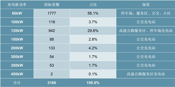 2019年国家电网招标的3165套充电桩,新建项目占比87.3%。从充电桩功率来看,60kW和120kW占比较高,主要适用于停车场、服务区、小区和高速服务区、停车场等场景;100kW和150kW以上功率的充电桩主要适用于公交车充电站。从场景来看,公交充电站、停车场、服务区充电桩招标比例较高,分别为13.24%、12.10%、6.64%。
