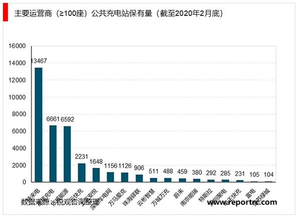 就充电站而言,截至2020年2月底,充电站数量超过100座的运营商共有19家(不含国网),其中前三大运营商特来电、星星充电、依威能源的充电站数量都多于6000座,遥遥领先于其他运营商。