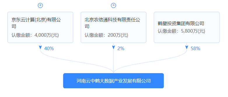 河南云中鹤大数据产业发展有限公司由鹤壁投资集团有限公司(持有58%股权)、京东云计算(北京)有限公司(持有40%股权)、北京农信通科技有限责任公司(持有2%股权)共同出资成立。