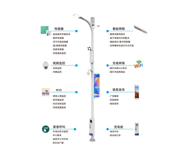 智慧灯杆是一种集成各种信息设备技术创新复合应用的智慧路灯产品,整个智慧灯杆内包含路灯照明控制系统、WIFI天线基站、视频监控管理、广告屏播控系统、城市环境实时监测、紧急呼叫系统、充电桩系统和井盖监测系统等应用。