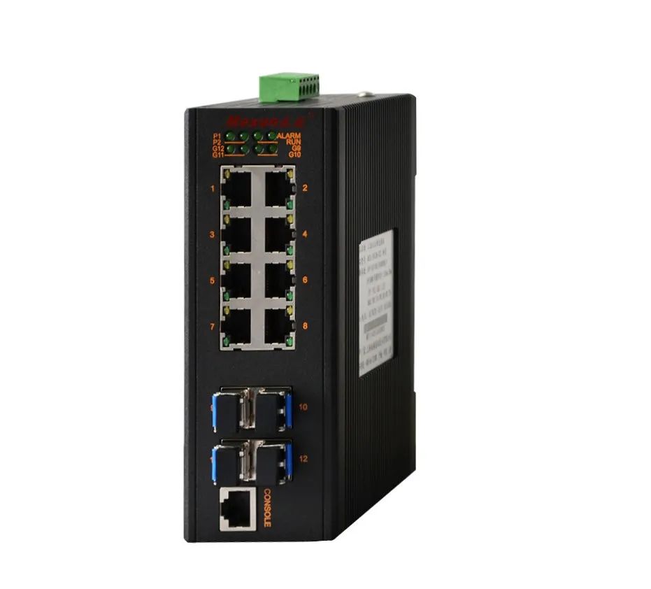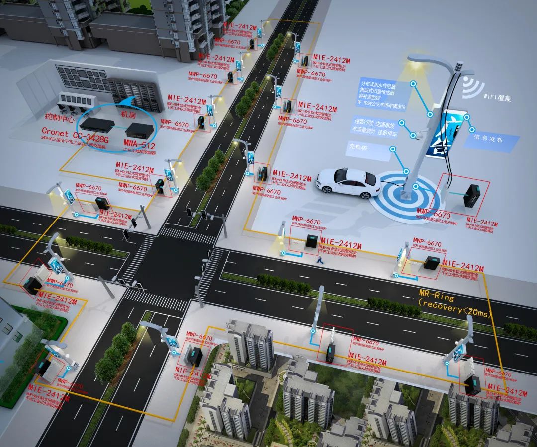 此方案中,每个智慧灯杆内放置一台MIE-2412M卡轨式网管型工业以太网交换机,提供8个10/100/1000M电口,4个SFP千兆扩展槽。灯杆上传感器、摄像机、对讲机、LED显示屏、无线AP等子系统终端全部通过RJ45网线接入交换机电口,并通过交换机千兆光口与路口就近其他灯杆内交换机形成千兆自愈环网。环网内其中一个路口灯杆内交换机作为汇聚交换机,使用另一个光口,通过租用的运营商光缆传回控制中心。